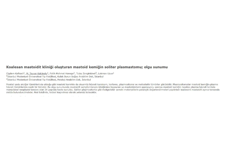 Devamını OkuProstat yada akciğer tümörlerinde olduğu gibi mastoid kemikte de skuamöz hücreli karsinom, lenfoma, plazmositoma ve metastatik...