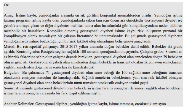 Amaç: İşitme kaybı, yenidoğanlar arasında en sık görülen konjenital anomalilerden biridir. Yenidoğan işitme tarama programı işitme kaybı olan yenidoğanlarda erken tanı için önem arz etmektedir Gestasyonel diyabet ise gebelikte ortaya çıkan ve diğer diyabetes mellitus tanısı alan hastalardaki gibi komplikasyonlara neden olabilen metabolik bir hastalıktır. Yazının tamamı için tıklayın.